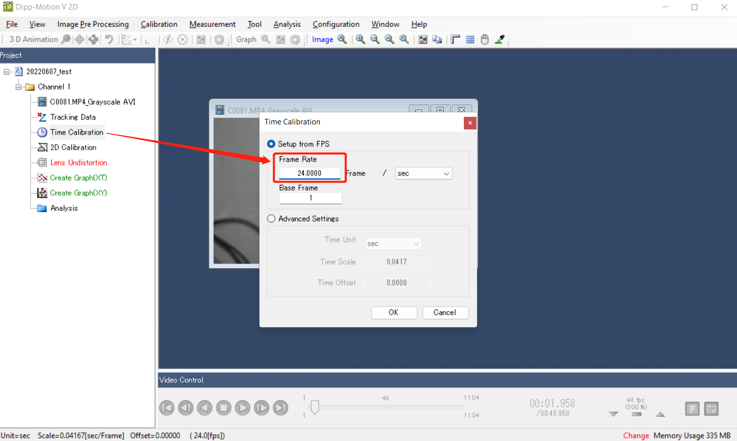 - 時間のキャリブレーション(動画のフレームレートFPSを入れる).