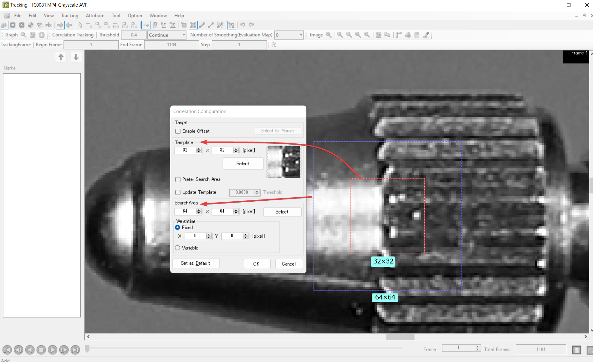 - 変位計測点にマーカを設置する(追尾モードは相関追尾に設定).