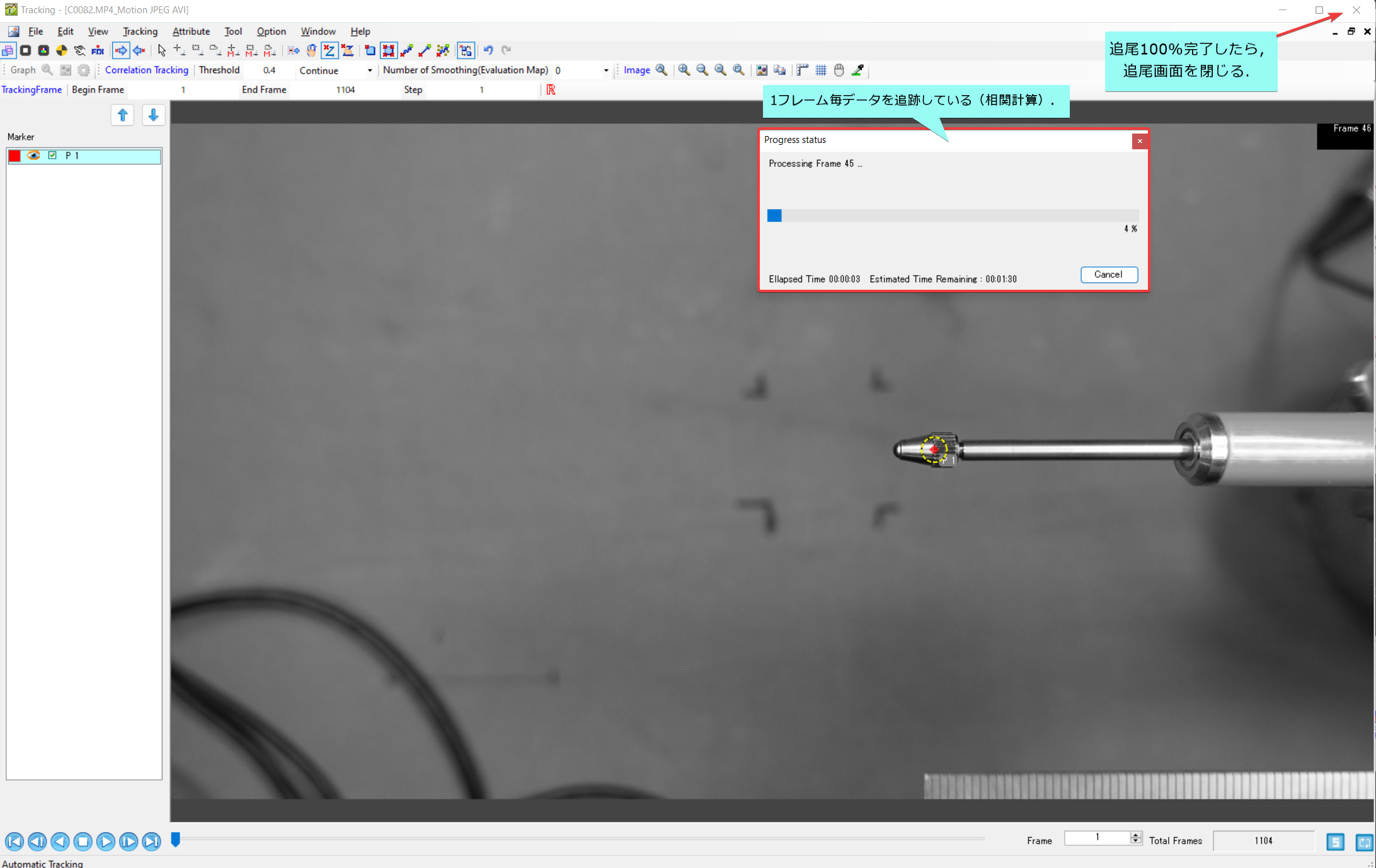 DICは1フレームごとに追尾を行う.追尾が100%になったら,追尾を終了し,画面を閉じる.